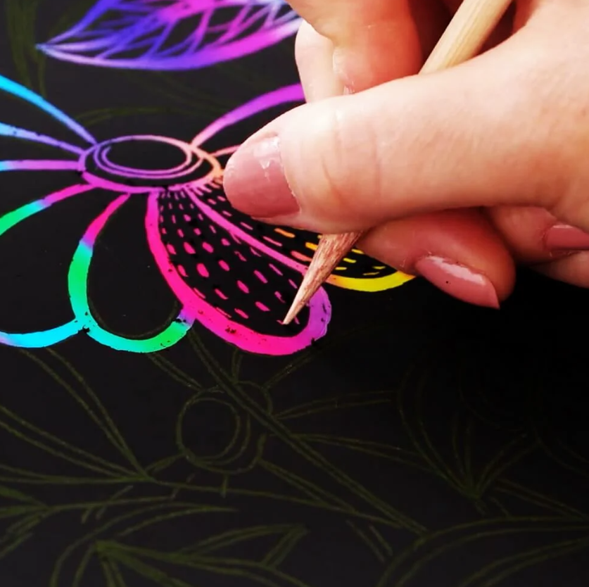 Papel arcoíris: Utiliza el lápiz de madera para descubrir un mundo de color bajo la superficie negra mate. Ideal para actividades artísticas y divertidas para niños y adultos.