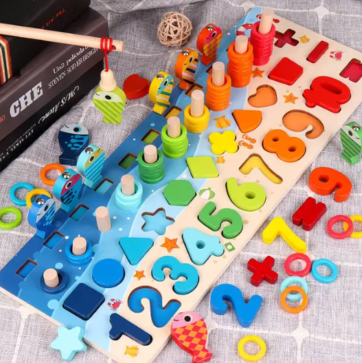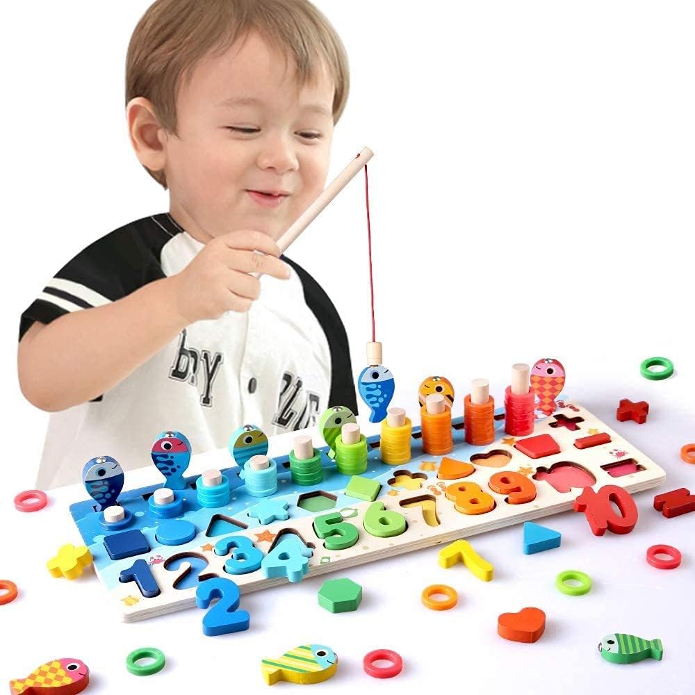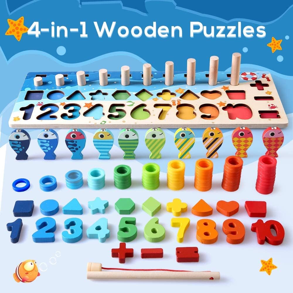 - 🎁 Explora 4 emocionantes actividades: Sumérgete en un mundo de aprendizaje con nuestro tablero de bloques de madera 4 en 1. Incluye 55 anillos, 10 peces magnéticos, 10 formas, 10 palos, 10 números, 3 SIMBOLOS matemáticos, un palo de pesca y un tablero de juego colorido, ¡todo para una diversión y aprendizaje sin fin!